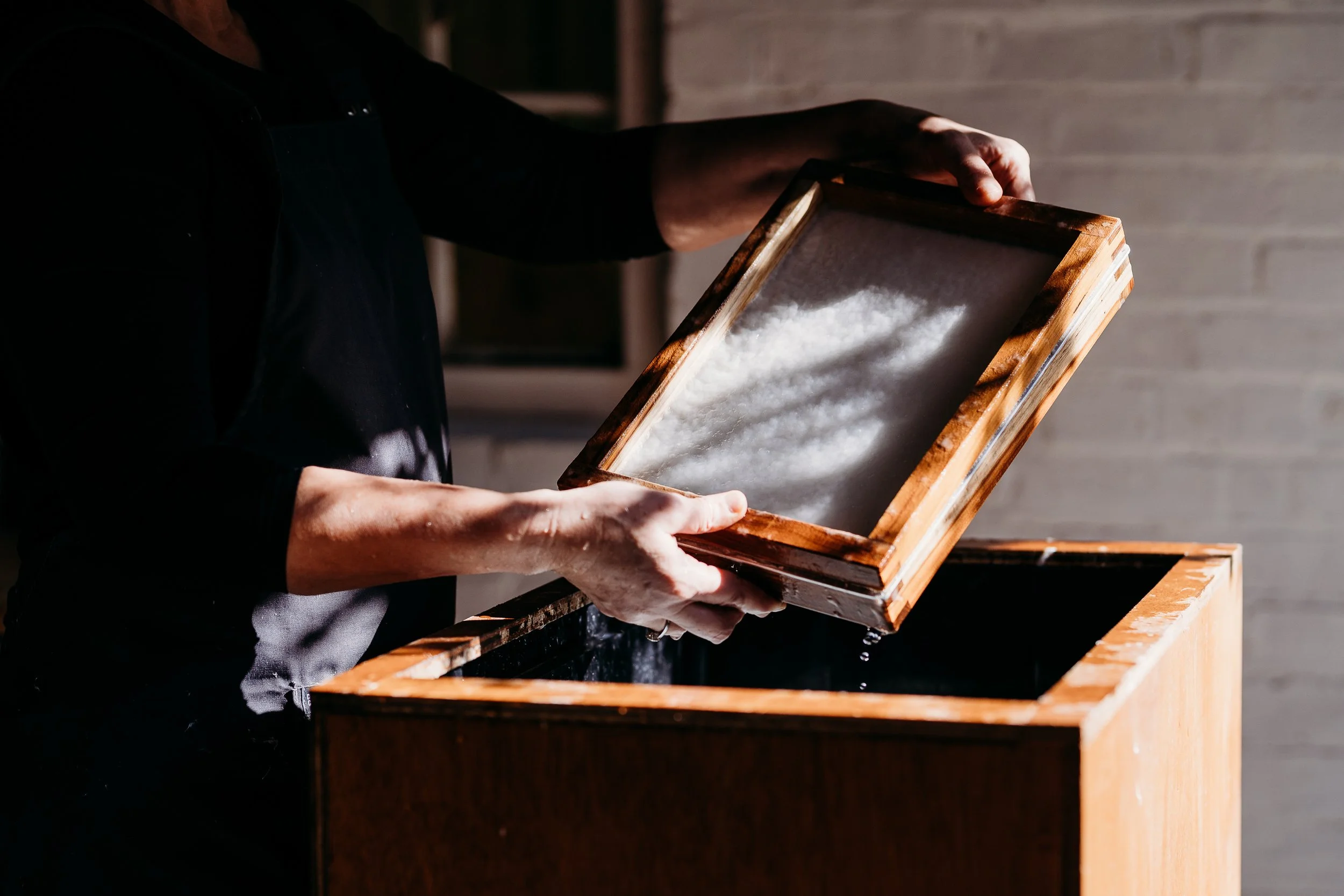Paper making has been flourishing in Western Europe for centuries. Traditionally, it was made from old clothes, such as linen rags. These were cut into small pieces, beaten to a pulp and dispersed in a vat of water. A sheet of paper was formed by a particular motion of dipping and lifting a mould and deckle (specific papermaking tools comprised of two frames, one covered with the wired mesh). Nowadays, very few paper mills make paper by hand and consequently their papers are highly regarded, mainly used for art or book restoration. It is encouraging that paper enthusiasts and artists in their studios continue to support the revival of the traditional papermaking craft.